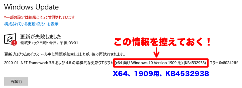 まず、Windows10 Updateの更新失敗した画面で3つの情報を控えておきます。