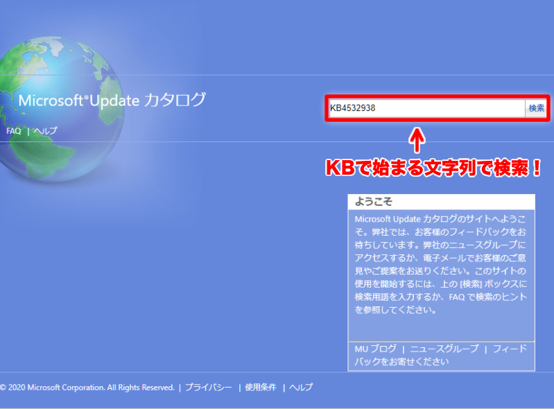 「Microsoft Updateカタログ」ページが表示されたら、先程控えておいた頭が「KB」で始まる文字列で検索します。今回の場合だと「KB4532938」ですね。