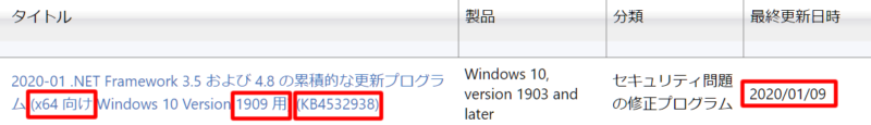 更新プログラムがいくつか表示されるので該当するものを探します。ちなみに、私の場合「Windows10」「64bit」なので一番上の「x64向け」を選びました。