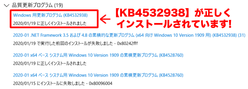 Windows10の自動アップデートで更新失敗していた「KB4532938」が正しくインストールされましたと表示されてます。