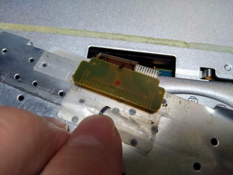次にキーボード側、基盤みたいな所と剥がします。すると本体からのフラットケーブルと繋がるコネクタが見えます。