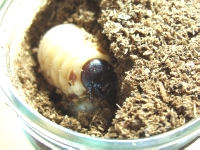 コーヒービンで飼育しているカブトムシの幼虫君をひとつ、部屋に置いてたら「カリカリ」ってなんか物音がするんですよ。最初は何の音だかわからなくて、音の発生源を探しました(笑)。ようやく、幼虫君だと気がついて、ビンのフタを開けたところの様子です。「どうしたん?」って私が声をかけると「んっ!」ってこっちを向くじゃないですか。「かわいいっ」なんて思っちゃいました。でも、なんで「カリカリ」って呼んでたのかなぁ(そう思ってるだけ?)ひょっとしたら、暖かい部屋に置いてたから、息苦しくなってきてたのでしょうか?(ガス発生?) だとしたら、のん気なこと言ってられませんね(汗)