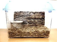 コバエ防止フタの付いた、プラケース大に、コルク背面ボードをセットして、エサ皿もセットしました。マットは、ダニ防止のため、水ゴケを使用することに。う~ん、なんかイイ感じ^^。ほんとは、100円ショップで、葉っぱとツルのついたのも買ってきてグリーンをプラスしようと思ったら売り切れてました。残念。 |
