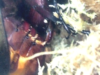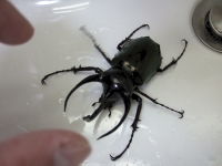 コーカサス君に、ひとっ風呂浴びてもらうことにしました。使い古しの歯ブラシでゴシゴシとやりました。クビのおなか側のところにいました。ウジャウジャとダニが・・・。やっぱり、きれいにしてから、お引越しですね。しかし、アトラス以上の凶暴ぶり。どこを持っていいかわからない。パンチング攻撃 怖いよぉコイツ。コーカサスはのクビの付け根も刃物のようになってるのでほんとに持つところがないよぉ。 |