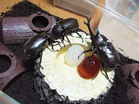 これには、ペアリングを控えていた赤カブトのオス君も驚いた様子で、観戦していました。このままでは、ペアリングどころではないので、仕方なくメスを1頭だけにして、ペアリングをすることに・・・。オス・メスともに、後食もしっかりしていたので大丈夫だとは思っていたのですが、やはり心配なものですね。
