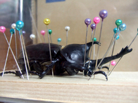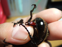 オスの方は、例によって標本にしてみました。生きていたときに比べて赤味が少なくなったような気もしますが、写真の移り方によるところもあるかもしれません。あと一頭カブトのオスがいるのですが、こちらは随分と元気なようで、私のてにつかまらせておくと交尾しようとしてきました。