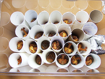現状で、25匹の国産カブトの蛹たちが路頭に迷うことになったわけです。困ったものです。だって、3週間以内にこれらの蛹たちが成虫になるわけですから、3週間以内にトイレットペーパーの芯を25本、必要なわけで、普通に暮らしてて貯まる本数じゃないですよね。そこで、嫁さんにたのんで、近所の奥様たちに声かけてもらって集めてもらいました。なんとかかき集めて、今回の人口蛹室25連発と相成りました。