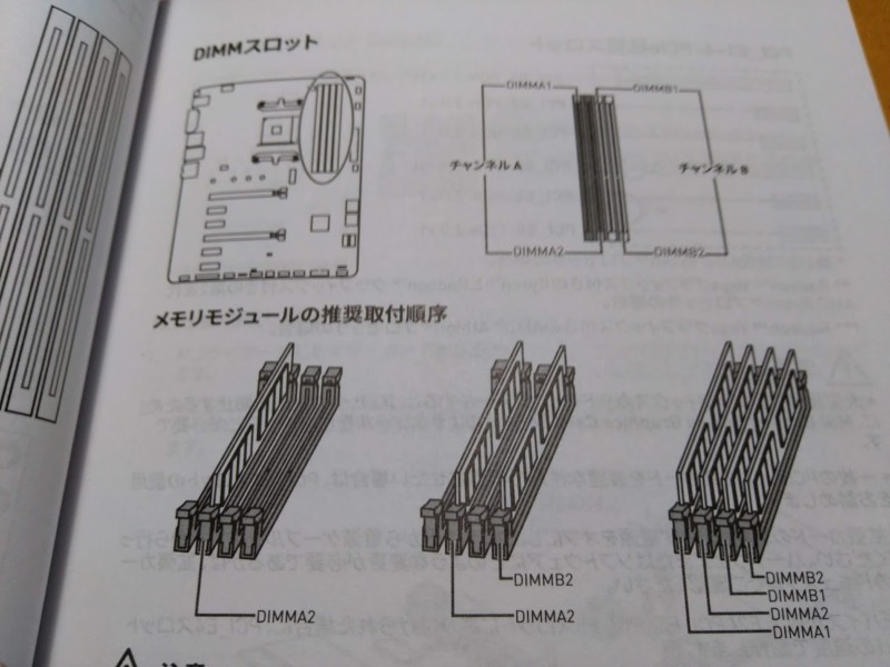 でも、マザーボードの取扱説明書は黒のみ印刷されてイマイチどのメモリスロットを使うのかわかりにくかったです。